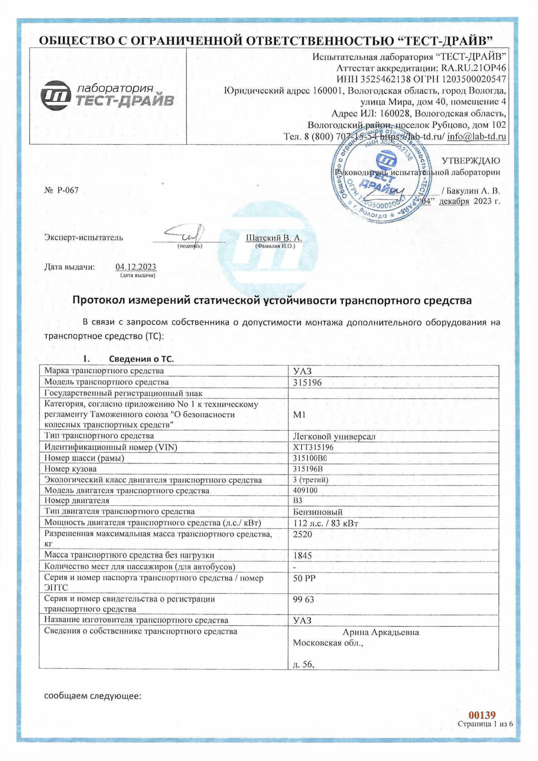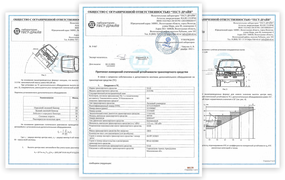 Расчет поперечной статической устойчивости — это официальное заключение, подтверждающее, что модернизированное или переоборудованное транспортное средство сохраняет безопасный угол опрокидывания. Иными словами, документ показывает, что внесенные изменения не ухудшили устойчивость и автомобиль остается безопасным для эксплуатации.